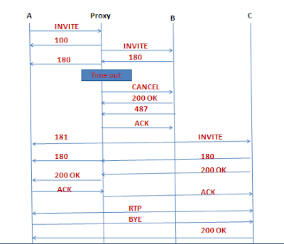 The User B on receiving the INVITE sends a TRYING 100 to proxy followed by a Ringing 180. It is at this time the telephone begins to ring and it is also reroute by the proxy to the User A.